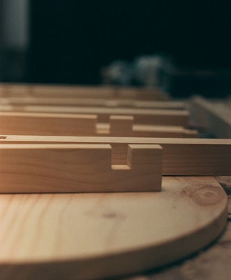 Durante las siguientes visitas realizadas al taller se encontraba en el proceso de fabricación de una mesa de estilo Japonés con la superficie superior modificada en forma circular. Considerando que el producto final iba a ser manipulado por niños propuso este cambio con una intención personal también de modificar la esencia formal del objeto y su relación con el espacio en el que esta se usará. Podemos apreciar una estructura que presenta un carácter rígido formada por listones que se entrecruzan y le otorgan estabilidad suficiente para disponer en la parte superior el plano principal, dotado de curvas que dan aún más la sensación de levedad que caracteriza a este tipo de objetos. La mesa ha quedado finalizada estructuralmente , y a falta de aplicar el pegamento para realizar las uniones de las piezas principales me explica los acabados que ha planteado y el resultado final esperado. Para ello diseñará una secuencia de líneas que se imprimirán con serigrafía de lado a lado y aunque aún falta definir el tono exacto de la tinta que se usará la idea es aplicar cera de abejas para sellar la madera después de la impresión y resaltar los colores tanto del material como de la tinta.
